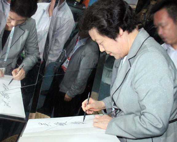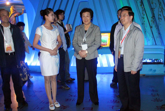 10月22日,司法部部长吴爱英访问了世博会山东馆。吴爱英兴致勃勃地来到山东馆,详细观看地各展品、展项,了解了山东馆的建筑造型、设计理念和展示内容,在孔子像前留影纪念,在中厅观看了影片,关注地询问了山东馆的游客流量,对山东馆开放式的展示内涵和管理服务给予高度评价,对山东馆突出历史文化特色,大气磅礴、内涵深邃的成功展示表示赞许并签字留念。