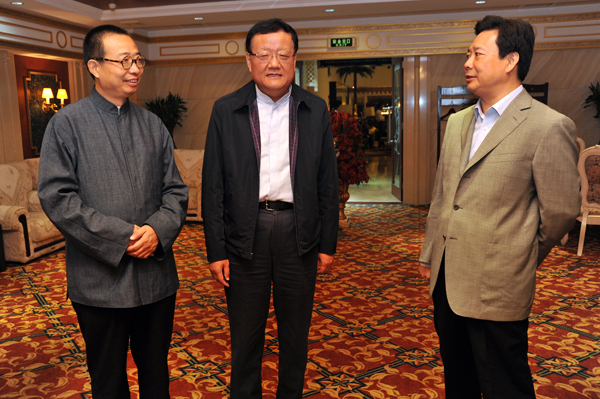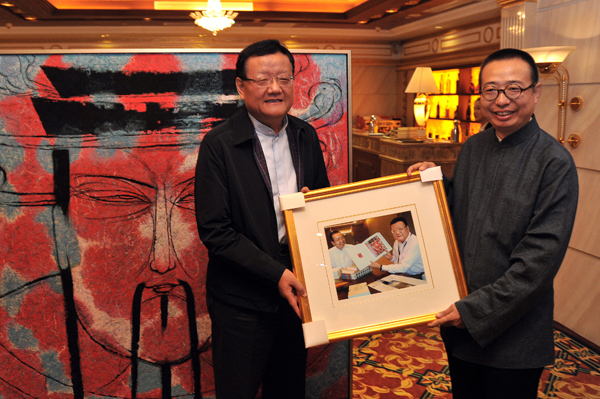9月27日,全国政协教科文卫体委员会副主任,凤凰卫视董事局主席、行政总裁刘长乐一行访问山东。山东省委常委、宣传部部长李群在山东大厦向刘长乐赠予潘鲁生绘画作品。山东省文联主席、我院院长潘鲁生出席赠予活动。 省委常委、宣传部部长李群,凤凰卫视董事局主席刘长乐,我院院长潘鲁生结合作品《中国门神(吉庆祥瑞)》就山东民间艺术资源与文化创意产业发展等话题进行了交流。凤凰卫视董事局主席刘长乐对潘鲁生院长作品给予高度评价,表示早在2009年与潘鲁生院长在香港凤凰卫视总部会见时,即对这一融会传统民艺与当代艺术的作品和创作精神留下深刻印象,指出立足民族民间艺术资源的雄厚基础,开展具有当代精神的创作,在全球化语境和中华文化艺术传承发展中,具有重要意义。同时赠送的还有潘鲁生院长访问凤凰卫视与刘长乐先生会谈交流的合影。刘长乐先生再次表示希望加强交流与合作,期待有机会对永利官网进行访问。