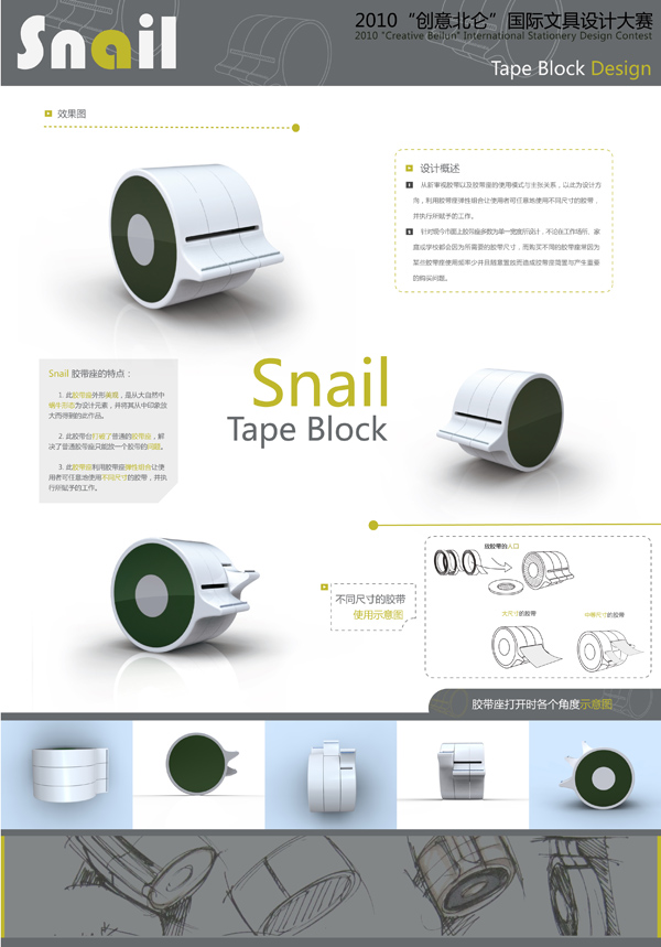 办公用品组金奖作品“Snail Tape Block”高效便捷胶带座 设计者王雷 指导老师:王智 付志伟