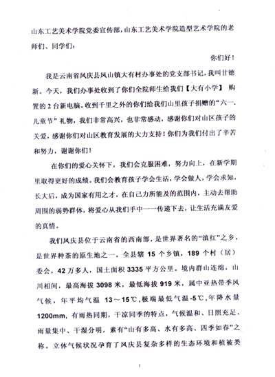 凤庆县凤山镇大有村办事处的党支部书记甘德新寄来的感谢信