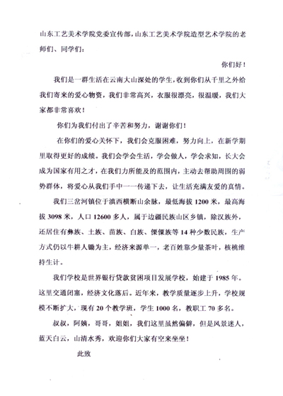 为发扬永利官网学子“奉献,友爱,互助”的志愿服务精神,激发当代大学生的社会责任感,为贫困山区的孩子们奉献一份爱心, 2010年5月10日——5月25日,304am永利集团官网党委宣传部与造型艺术学院联合举办了“有爱就有希望”大型爱心募捐活动。 活动以“有爱就有希望”为亲情呼唤点,由校广播台和造型艺术学院学生会承办,旨在为贫困山区的孩子们提供一个健康快乐的精神家园,让他们感受到社会大家庭的温暖,帮助他们树立起战胜困难、勇敢面对生活的勇气。 在活动筹划阶段,我们借助广播、电视、海报、横幅等校内宣传媒介,做了大量的准备工作。大家自制募捐箱,手绘宣传小展板,录制宣传视频,联系义演节目……每一个小小的环节都倾注了我们很多心血,我们希望把准备工作做到尽善尽美,用实际行动唤起大家的爱心,唤起社会对弱势群体的关注。 功夫不负有心人。5月10日上午,我们早早的餐厅路口布置好募捐场地。活动一开始,便吸引了众多的同学前来参与。老师和同学们纷纷积极响应,踊跃参与,慷慨解囊。不仅本校师生员工积极参与,就连经过的路人看到展板上孩子们纯真的笑脸,也纷纷表达爱心。得知活动的消息,山东轻工业学院08级装饰绘画班的50名同学来到募捐现场,捐款捐物。5月10日晚上,一场自发的义演活动在募捐现场上演着,同学们用自己优美的舞姿和歌声传递着我们的爱心,传递着我们对山区孩子的祝福。 募捐活动中的一个个镜头让我们感动着:一位不愿意留下姓名的同学送来了自己心爱的吉他和乐谱;志愿者协会的同学们捐献了一台电视机;一位女同学递上她积攒了很久的一个满满的存钱罐;当天错过捐款的老师后来主动找到我们,让我们一定将迟到的祝福送给山区的孩子……还有一个“姐姐”写给孩子的信,信中这样写到:“孩子,姐希望你能坚强,困难不可怕,可怕的是逃避”。是的,困难不可怕,因为有我们千千万万人的努力,当悲伤倾尽,有我们众志成城;当泪尽血续,有我们守望相助。 活动有期,爱心无限。截止到5月11日晚上7点,我们共募捐到现款4507.1元,各类书籍233本、衣服1067件、裤子457条、鞋子155双、电视机一台等若干物品。 活动结束后,我们主动联系受助单位,争取在第一时间将善款和爱心物资寄出。但是由于受到自然、地理等条件的限制,我们无法将全部物资送往云南省临沧凤庆县。为了不辜负全校师生员工的真情和爱心,我们又积极联系济南市红十字会,就近选择支援单位。 5月18日,首批爱心物资发放活动正式启动。同学们冒着炎炎烈日,将一箱一箱、一捆一捆的书本、衣物装运上车,满满的两车物品代表着永利官网师生满满的爱心。包括1000余件衣物、鞋子以及上百本图书在内的物品由受到济南市长清区红十字会委托的长清区孝里镇教委接收,并统一发放给该地区贫困地区的学生。 5月20日,我们将募集到的4507.1元全部善款和爱心物资寄往云南省临沧凤庆县大友小学和三岔河中学,由当地教育部门工作人员为大友小学师生购得2台教学用的新电脑,并为三岔河中学的孩子们准备了若干六一礼物。 6月3日,我们收到了云南省凤庆县凤山镇大有村办事处的党支部书记甘德新和三岔河中学受助学生寄来的感谢信,在回信中甘书记表示,在大家的爱心关怀下,他们会克服困难,努力向上,会教育孩子学会生活,学会做人,学会求知。三岔河中学的孩子也在回信中写到千里之外寄来的爱心物资,他们非常喜欢,他们要在爱心的激励下,更加努力的学习,长大后成为国家的有用之才。在力所能及的范围内,主动去帮助周围的弱势群体,将爱心一一传递下去,让生活充满友爱和真情。 从活动策划到结束的一个月时间里,我们一次次的感动着也快乐着,为老师、同学们的爱心而感动,为贫困山区的孩子们的生活得到改善而快乐,爱心是不需要用任何言语来修饰的,行动更足以诠释它的内涵,而我们正是在用行动、用爱心之手去诠释着奉献的意义。后期,我们将通过广播、电视、海报等形式对募捐结果和物资使用情况进行公示,以此感谢全校师生对活动的支持,感谢你们的真情和爱心。 虽然我们的经济能力有限,但是只要有我们的爱心在,相信远方的孩子们一定能感受到来自老师和同学们的温暖。同播温情种,共筑爱心墙!我们相信只要人人都献出一点爱,世界将变成美好的人间!