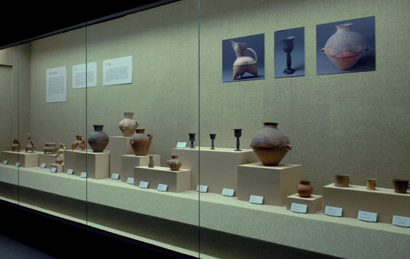 陶瓷陈列室主要展陈陶瓷器、玉石器等260余件。陶瓷器涵盖朝代较广,从新石器时代直至近现代社会的217件器物,在一定程度上展现了中国陶瓷史的发展脉络。陶瓷藏品种类也较多,实用器具、明器、建筑用器等均有所涉及。