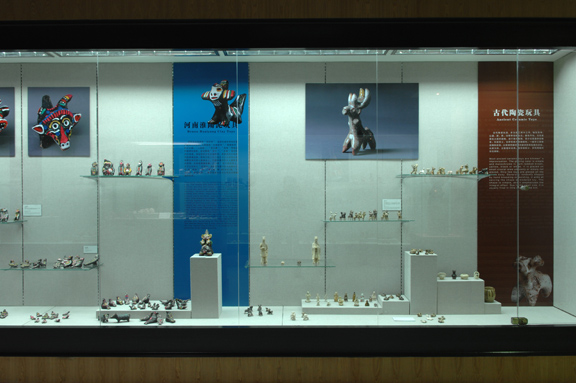 民间玩具陈列室展陈古代陶瓷玩具、近现代民间玩具近千件,涉及地域广泛,包括河南、河北、陕西、贵州、江苏、北京、新疆、山东等诸多省市地区;品类多样,材质丰富,以泥玩具为主,陶瓷、木、纸、布、草编玩具也均有所涉及。