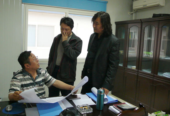 与山东省援川前线指挥部副总指挥孟雷讨论壁画方案