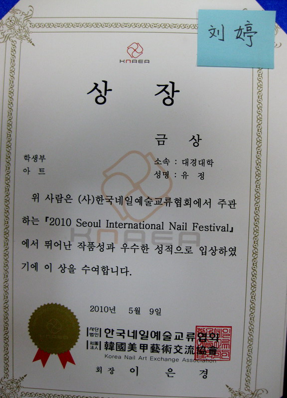 5月6日至5月9日,在韩国美甲艺术交流协会举办的“国际美甲交流大赛”中,应用设计学院赴韩交流学生参赛并获得优异成绩: 07级化妆班刘婷同学荣获金奖; 07级化妆班彭杏娟同学获得银奖; 08级化妆班王常伟同学、李羽憧同学获铜奖。 本次大赛是社会时尚界人士以及高校化妆专业学生参与的专业美甲交流活动,分为社会部和学生部两大版块,各自设置金奖一名、银奖一名、铜奖三名、优胜奖6名。