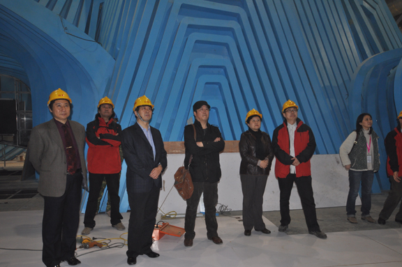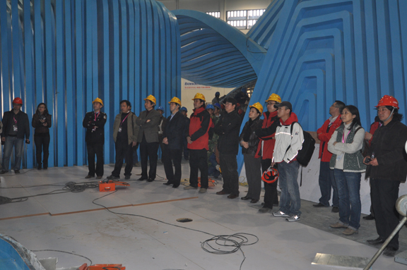 世博会山东馆副总指挥郭去尘、毕剑翎、韩文涛,工程组组长张震,设计组组长王延羽,影视组组长韩青,王志颖、赵云波、李海涛、宋鲁、沙重龙、王瑞奇、韩英杰等在山东馆施工布展现场一起陪同接待。院办王玉杰一同前来陪同慰问。