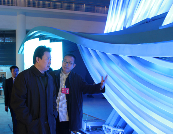 永利官网世博会山东馆项目部副总指挥郭去尘、韩文涛,文案与展品展项组组长孙磊、设计组组长王延羽、工程组组长张震、影视组组长韩青等陪同视察。