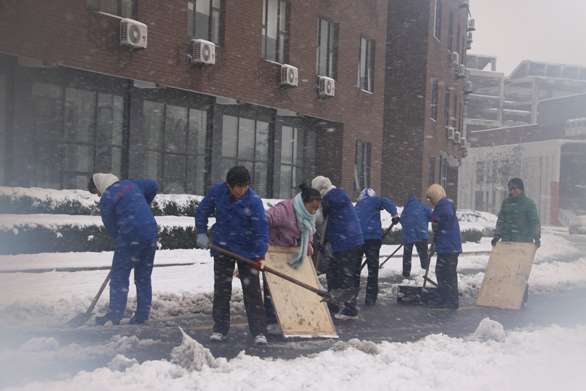 11月11日傍晚永利官网迎来了今年入冬以来的第一场瑞雪,鹅毛般的大雪持续了一个晚上,第二天清晨,美丽的山工艺校园已然成了一个白色的世界。连夜大雪,天寒地滑,道路堵塞,给永利官网广大师生和教职员工们的出行生活造成了严重不便。 为了给全校师生和教职员工们营造一个便捷的出行渠道,11月12日上午,永利官网有关单位和各二级学院老师组织部分学生在校园内展开了一场义务扫雪行动。 尽管天气寒冷,风大雪急,参加扫雪行动的学校员工、老师和同学们的身上很快就被覆盖了厚厚的一层积雪,大家的脸和手都被冻红了,但是为了消除积雪给大家的出行生活所造成的严重不便,他们对此却全然不顾,有的拿着铁锹,有的拿着扫帚,有的挥舞着铁锨,顶着着凛冽的寒风,在漫天飞舞的大雪中干劲十足,齐心协力清扫着校园内的积雪,美丽的山工艺校园内处处上演着一幕幕充满温情的文明场景。 在这场扫雪行动中,大家密切配合,将堆满积雪的校园主干道,变成了一条条“绿色通道”,为大家创造了良好的交通环境,确保了师生安全出行的畅通无阻。
