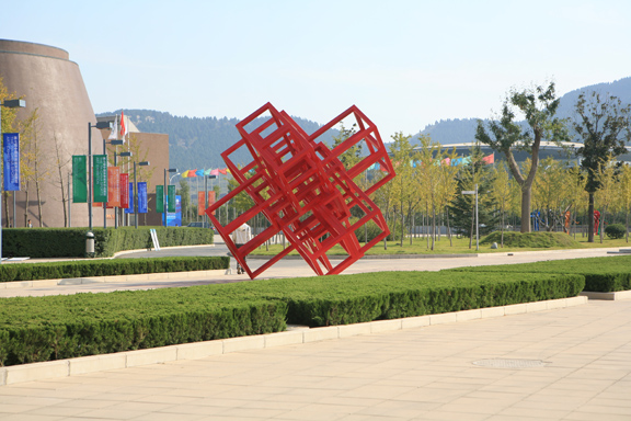 雕塑作品《鲁班智慧》创意来源于“鲁班锁”。作品通过对鲁班锁内部结构的概括处理,以线造型,形式类似于中国古典建筑的榫卯结构,