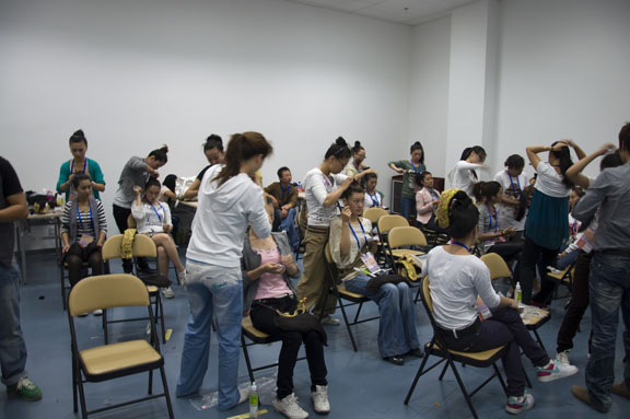 9月下旬,由304am永利集团官网妆扮艺术设计专业青年教师赵炜璐和宋菲菲带队的20名妆扮艺术设计班学生和9名服装设计班学生,在山东商业职业学院进行封闭式培训。她们将参与全运会开幕式的服装、化妆造型的任务。积极参与全运,全力服务全运,是学生施展才华、奉献青春、服务社会的广阔舞台。 9月21日,在全体师生和央视工作人员的共同努力下,将一千多名演员的服饰及时搬运并发放到演员手中,体现了工艺美院师生们的团结合作的精神。9月24日,在演员管理组安排下,由医疗卫生组疾控人员为永利官网师生注射了甲型H1N1流感疫苗,体现了组委会对广大工作人员的关心,也确保了今后工作的顺利进行。9月25日,31名师生前往奥体中心参加全运会开幕式演出化妆发型培训。由央视的石会玲老师授教,在学习过程中师生之间加深了交流。 为了确保演出的完美,同学们利用休息时间勤加训练,在这一个星期的时间里,师生们牢记职责使命,严格要求自己,遵守组委会的各项纪律要求,在工作中围绕中心,服务大局,全力做好演员、礼仪小姐的化妆发型和服装搭配等工作,争取为全运会做出自己的贡献。