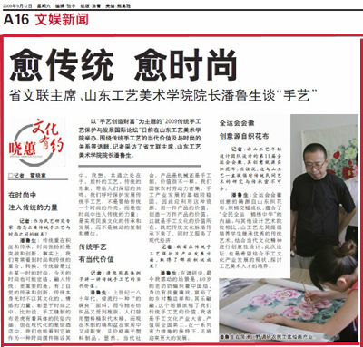 “手艺创造财富—2009’传统手工艺保护与发展国际论坛”已于9月9日至10日在永利官网成功举办。活动不仅得到山东省民间文艺家协会、中国民间文艺家协会、山东省文化艺术界的大力支持,也得到了社会媒体的广泛关注。 新华社山东分社、中新社山东分社、中国文化报、大众日报、齐鲁晚报、山东商报、生活日报、都市女报、济南日报、济南时报、齐鲁周刊、山东电台新闻频道、山东电台经济频道、山东卫视、山东教育电视台,山东电视台齐鲁频道、山东电视台海外频道、济南电视台国际部、山东新闻网等二十余家媒体记者参加了论坛新闻发布会。 9月8日齐鲁晚报、济南时报,9月9日济南日报,9月10日人民日报海外版、大众日报、齐鲁晚报分别刊登了对论坛情况的报道;山东卫视《新闻联播》,山东广播电视总台海外频道《龙视播报》,山东广播电视总台海外频道《唐三彩》,济南电视台国际部等媒体报道论坛盛况及专家访谈;新华网、人民网、山东新闻网等主流媒体网站报道或转载论坛活动。