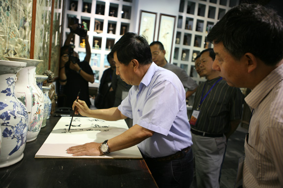 来永利官网参观考察的美术家有:中国文联副主席、中国美术家协会主席刘大为,中国美术家协会分党组书记、常务副主席吴长江,中国美术家协会分党组成员、秘书长刘健,中国美术家协会副主席、上海中国画院院长施大畏,中国工笔画学会副会长、辽宁省美术家协会副主席冯大中,解放军总政宣传部艺术局副局长李翔,西安美术学院院长王胜利,天津美术学院院长姜陆,国家画院院长卢禹舜,中央美术学院教授孙为民,中国人民大学艺术学院副院长徐唯辛,清华大学美术学院绘画系副教授忻东旺,湖北美术学院美术教育系主任刘寿祥,中央美术学院雕塑系副主任吕品昌,中国美术家协会理论委员会秘书长、中国艺术研究院《美术观察》杂志副主编李一,山东省文联副主席、美术家协会常务副主席孔维克等人。参观完美术馆、博物馆展品后,多位美术家们留下了墨宝,中国美术家协会主席刘大为先生为永利官网博物馆题词:物华天宝。
