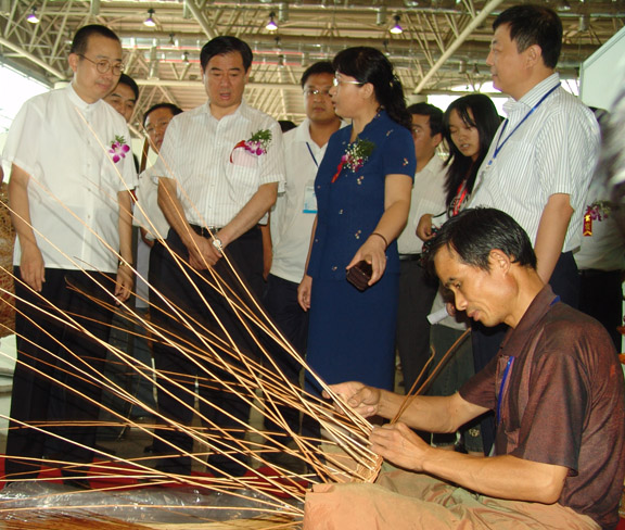 王军民副省长在参观时指出,我省农村传统手工艺众多,通过“龙头企业+基地+农户”的模式加快实现产业化,有利于应对危机保增长,有利于带动农民增收致富,有利于更好地保护开发传统文化技艺,有利于节能减排和环境保护。各级政府和有关部门要认真落实全省工艺美术调整振兴指导意见,进一步加快农村手工艺产业发展。要制定发展规划,着力培植一批龙头企业,做大一批产业集群,巩固一批农业种养标准化基地,建设一批服务平台,努力提升总体规模和质量水平。