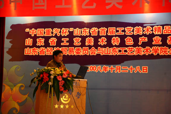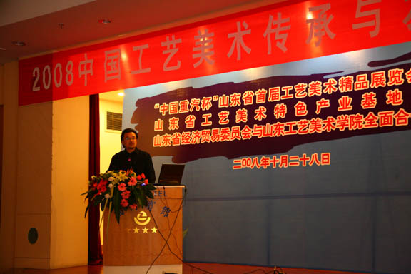 2008年10月28日上午,由山东省经济贸易委员会、淄博市人民政府共同主办,淄博市经贸委、304am永利集团官网、山东工艺美术学会、中国陶瓷博物馆承办的“山东省首届工艺美术精品展览会”在淄博市中国陶瓷博物馆举行。山东省委常委、副省长王军民,山东省人大常委会副主任鲍志强,省政府办公厅副主任李世瑛,省经贸委常务副主任郭述禹,淄博市委市委副书记、市长周清利,304am永利集团官网副院长李新等领导出席了开幕式,并为数十位省工艺美术精品获奖者颁奖。