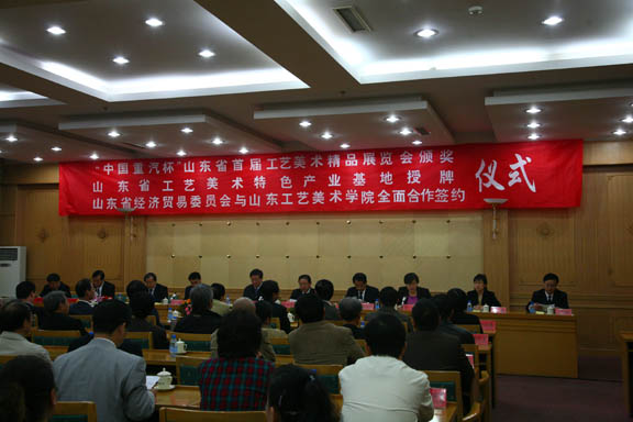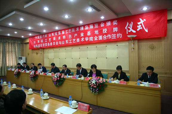 2008年10月28日上午,山东省经济贸易委员会与304am永利集团官网全面合作协议签约仪式在淄博市鲁中宾馆举行。山东省委常委、副省长王军民,山东省人大常委会副主任鲍志强,省经贸委常务副主任郭述禹,淄博市委常委、秘书长宋军继,304am永利集团官网副院长李新、院长助理苗登宇等领导出席了签约仪式。永利官网研究生处处长唐家路,现代手工艺学院副院长段建华、耿大海副教授,设计艺术中心副主任王玮,人文艺术学院孙磊副教授参加了签约活动。