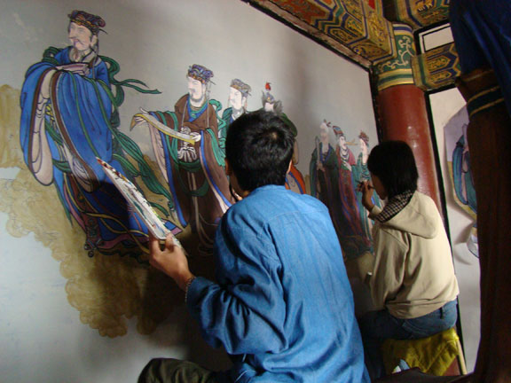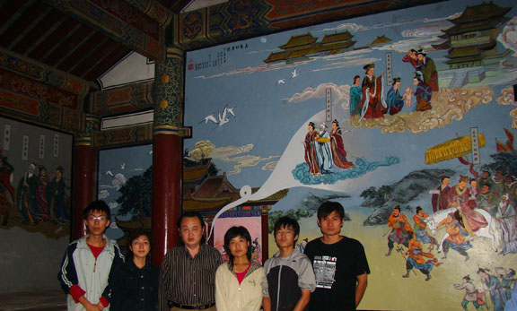 6、大学生文化宣传服务团。 响应团中央,团省委提出的“文化下乡”的要求,组织大学生文化宣传服务团,传播文化,用实际行动阐释志愿精神、展示青年风采、提升公民素质。 (1)现代手工艺术学院赴泰山文化创意与宣传小分队 7月16日在304am永利集团官网客座教授叶兆信老师、现代手工艺术学院党总支书记、副院长段建华老师及孟老师带领下,现代手工艺术学院05、06级7名学生组成的壁画小组来到了五岳独尊的泰山,到达了最高峰玉皇顶开始了长达一个多月的“泰山文化创意与宣传”的历程。 本次活动同学们主要负责玉皇庙中玉皇大殿的三面墙壁的绘画修饰。壁画内容是围绕玉皇大帝展开的神话传说的主题绘画。内容丰富多彩,人物形态栩栩如生,让学生们领略了中国宗教文化的博大精深以及古代神话传说的神韵传奇,也以绘画的形式传播了宗教文化,让更多的人去了解它。