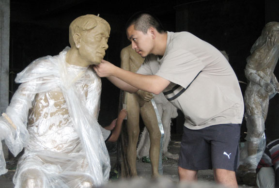 (4)造型艺术学院赴微山县雕塑社会实践小分队 7月10日,造型艺术学院赴微山县雕塑社会实践小分队的队员们在学院领导老师们的带领下前往济宁市微山县指导并参与微山县文史馆雕塑展品的制作。 7月11日早晨,在微山县政协马主席的陪同下,造型艺术学院师生实地考察了文史馆的筹建情况。雕塑教研室主任陈佶生教授、杨勇智老师带领同学们现场丈量了场地,并与当地工人进行了沟通与交流,简单预定了制作材料与所需工具等。同学们通过参观微山湖湿地、铁道游击队纪念馆等搜集了创作素材,激发了创作灵感。制定好计划分组后小分队开始了制作过程。7月12日,小分队进入展品正式制作阶段。任务是为微山县文史馆制作两组雕塑,共14名等大的革命前辈。烈日炎炎,大伙在太阳下制作人体雕塑骨架,两人共同完成一个战士雕塑的制作。经过一周时间,完成了所有作品的基本型。7月19日,进入细部深入刻画阶段,我们重点塑造人物形象,力求生动准确,并根据配以的枪械对动作进行整体调整。7月22号开始翻制模具,翻制共用了17天的时间。8月6号进行表面效果处理。8月7日全部雕塑整体上色摆放并调整,工作圆满完成。 造型艺术学院社会实践小分队在实习的过程中不仅提高了自己的动手能力,同时也展现304am永利集团官网大学生高超的艺术水平和良好的精神风貌,受到了微山县政府和人民的高度赞赏。
