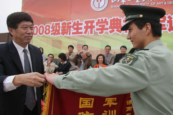 大会上,领导向获得军训先进集体荣誉称号的单位和集体颁发奖状,向各位辛苦奋战的军训教官颁发荣誉证书。颁奖仪式后,人文艺术学院孙磊老师代表全体教师发言,对新生的到来表示欢迎并并提出希望。视觉传达设计学院2008级学生宫昭代表新生发言,工业设计学院2008及学生曹乐带领全体新生进行入学宣誓。