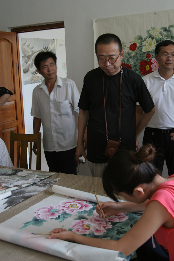 在巨野,课题组就巨野农民绘画产业的发展,先后调研了巨野鲁西书画院、洪庙书画专业村、巨野县书画院、书画一条街。巨野县的书画艺术历史源远流长,建国后巨野县的书画艺术创作队伍和书画产业规模迅速发展壮大,2000年被中国文联正式命名为“中国农民绘画之乡”。目前,全县有绘画专业镇数个,有一定创作水平的画师千余人,在全国建立固定销售网点近百个,年销售书画总产值几千万元。目前,全县基本形成了以县书画院为龙头,绘画专业镇、专业村为基地,创作从业人员为基群,目前已进入快速成长期。
