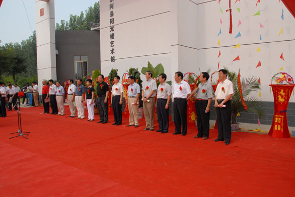 东阿县县委书记张旋宇致辞,他表示,东阿县阳光楼艺术馆是娄以忠、于茂阳、刘光三位东阿籍书法艺术家的作品展览馆、艺术陈列室,也是东阿县青少年书画艺术培训的基地。娄以忠、于茂阳、刘光都是当代中国卓有成就的书画名家,在全国书画艺术界具有很高的地位和影响力,三位艺术家多年来一直关心支持家乡的文化建设和经济社会发展,并将自己的艺术精品180余件捐赠给阳光楼艺术馆,这种心系故土、造福桑梓的赤热情怀感动和鼓励着家乡人民。东阿县阳光楼艺术馆的顺利开馆是东阿县打造文化强县、旅游名县的重大举措,也必将对东阿县的书画艺术及整个文化事业的发展产生重大而深远的影响。