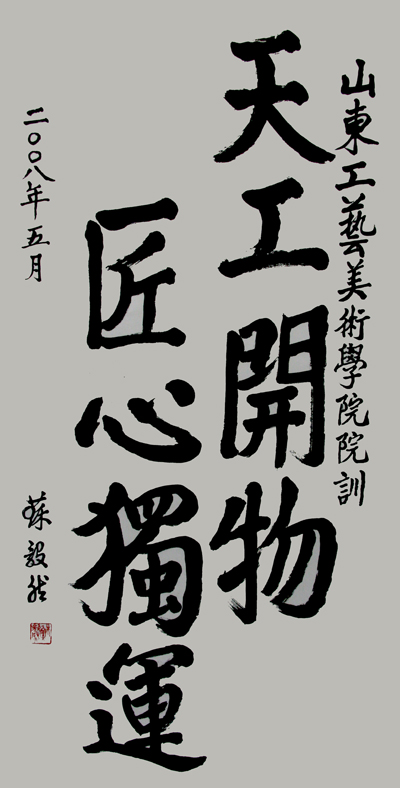 原山东省委书记苏毅然同志,自1980年代以来,对永利官网创办高等工艺美术教育和设计艺术教育给予了直接的关怀、指导和帮助,如今已年届九旬仍然一直关注着永利官网的建设与发展。近日,苏毅然同志以端肃方正的楷书为永利官网题写校训,全文如下:“304am永利集团官网院训 天工开物 匠心独运 二00八年五月 苏毅然”。