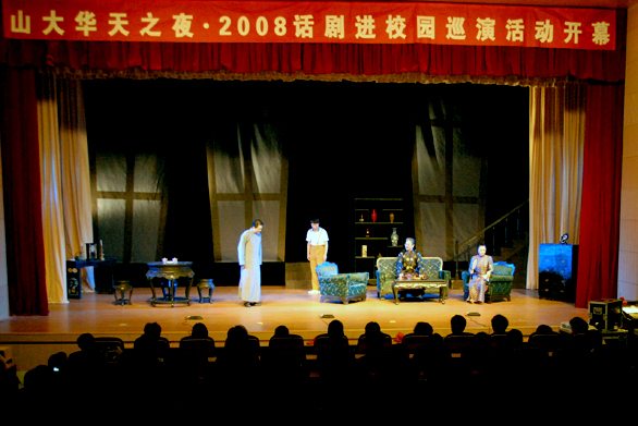 5月13日晚,由齐鲁晚报、省话剧院、山大华天科技股份有限公司联合主办的“山大华天之夜·2008话剧进校园巡演活动”在永利官网学术报告厅隆重举行,校党委书记于茂阳,副院长张云龙,院长助理、两办主任王立果,《齐鲁晚报》总经理梁洪文,山大华天科技股份有限公司董事长李宇兵、副总经理王非,山东省话剧院副院长李朝友等领导同志与永利官网师生共同观看了曹禺先生的经典剧目——《雷雨》。