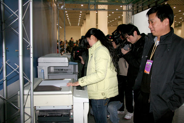、监察处主任刘跃进与操作人员分别在电脑上输入各自掌握的密码,打开题库,近千套试题开始循环流动,记者点中试题。审题专家根据今天考试有关情况,从抽取的两份试题中选取一套进行现场修改。定稿后,由纪委人员在媒体的监督下,送往文印处复印。上午8时,考试正式开始。