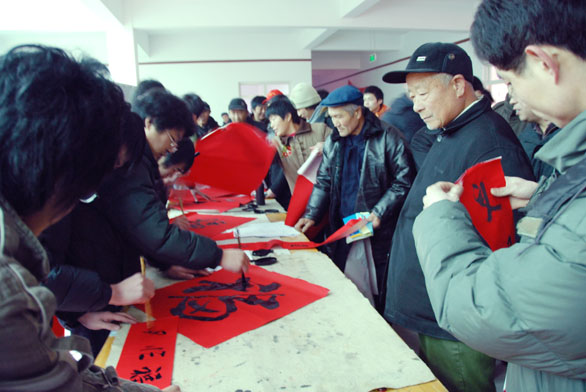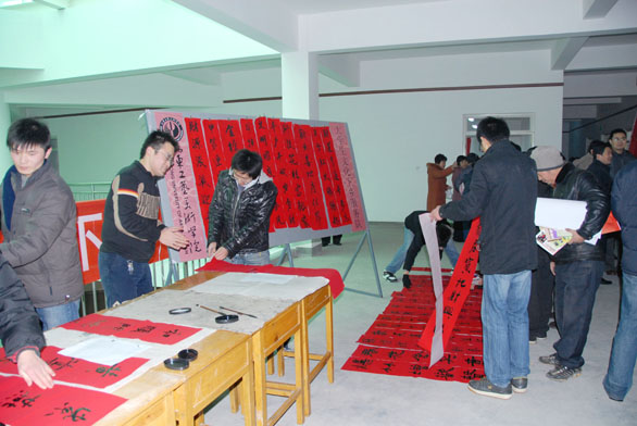 1月17日上午9至11时,永利官网师生积极参加了在长清乐山小区文化馆举办的大学生科技文化节活动,为社区赠送春联,带去浓浓的新年祝福。出席此次活动的领导有高校工委副书记宋焕新、永利官网副院长张云龙、学生处处长吴焕文,学生处工作人员和书法班同学。 长清大学园区各高校参加了此次活动,每个学校以不同的方式给社区带来了礼物,送来了温暖。有法律咨询、医疗服务、赠送新年礼品等多种方式,永利官网以赠送春联的形式,表达对大家的祝福,受到了居民的高度评价,同时也锻炼了同学们的专业素养。 在老师的带领下,学生们积极布置场所,悬挂春联。为了增加书写场地,把书法场地定在了大厅。紧接着同学们就开始动笔了,一会儿功夫一幅幅对联展现在大家眼前:“灵鼠迎春春色好,金鸡报晓晓光新”“绿酒添香甲子岁,雪花献瑞大丰年”“壬遇深恩心谢党,子图大业力描春”。笔迹俊秀、洒脱、苍劲,吸引了很多居民,一时成了整个会场活动的焦点。春联代表喜庆,也是过年的必需品,贴近生活,大受欢迎,早些写好的很快就一“抢”而光,现写的也供不应求,甚至墨迹未干就早已预定。居民的称赞声不断,拿到自己喜欢的春联,十分高兴。高校工委副书记宋焕新、张云龙副院长和吴焕文处长也到现场和居民一起分享喜悦,欣赏同学们的作品,给与了鼓励与赞赏。书法班的同学以自己过硬的专业技能赢得了大家的赞许。
