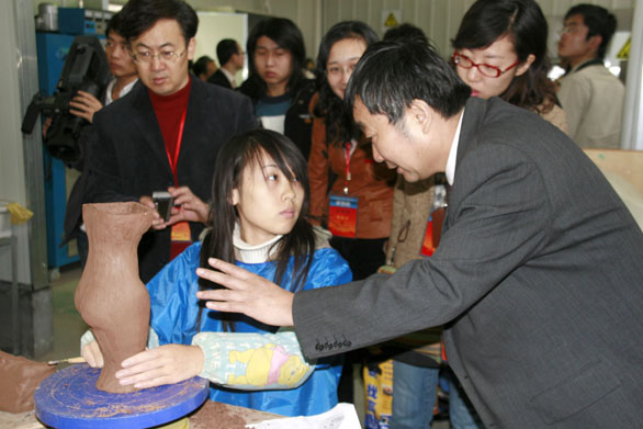 在综合实验中心,专家走访考察了服装学院工作室、书籍装帧设计实验室、服装设计与工程综合实验室、磨具加工与产品成形实验室、工业设计展示模型实验室、现代手工艺术实验室、陶瓷制作实验室、纤维与染织实验室等场所,了解实验室建设情况和实验课程开设等情况。 专家还饶有兴致地进行了实际操作,检查硬件设备使用情况。