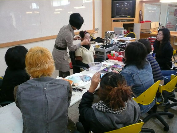 韩国善邻大学的工作室建设和实践教学非常有特色,值得我们借鉴和交流。其工作室设备齐全,管理完善,聘请了许多技术能力强、有社会影响力的人士负责学生的技能培训,学生大部分课程都是在工作室中进行。皮肤美容科长姜谨荣教授带领妆扮设计代表团参观了所有工作室及图书馆,并与发型设计和皮肤美容护理的教授进行了交流。随后,皮肤美容科科长姜谨荣专门给代表团上了一堂有意义的面部化妆彩绘课,耐心的给学生讲解了化妆品的应用知识以及创意彩绘化妆的技法,使学生了解了当今国际流行的趋势,懂得了如何去发现美、创造美,以更好的发挥自己的潜能,培养自身能力,争取更多更广的发展机遇。另外,姜教授亲自讲解示范,给代表团传授知识也为两校架起友谊的桥梁。