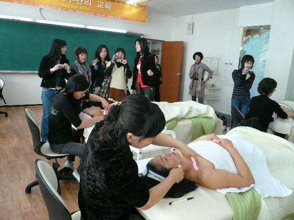 下午两点,姜谨荣教授带领妆扮艺术设计代表团一行9人分别参观了韩国浦项市医疗护理与皮肤管理医院和婚纱影楼礼仪馆。医疗护理与皮肤管理医院的营销项目包括整形美容、医疗、男士美容、女士美容、经络按摩和头皮管理,代表团在参观中观看了美容按摩师的实际操作。韩国美容经济的兴起,尤其是美容产业的迅速发展,不断推动了美容教育的兴起,使美容成为了一门学科纳入到高等教育的体系中,美容从客观方面来看包括化妆、发型、服饰、礼仪、护理、饮食等,每一学科都是一门学问,都是一种不同的文化,共同组成一个整体。婚纱影楼礼仪馆提供新婚人在婚礼前一个月的皮肤护理、婚纱摄影到婚礼到当天的化妆造型、发型设计、婚纱礼服与举行婚礼的礼堂以及宴会厅等一系列的全套服务。