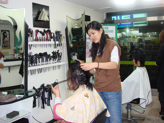 上午11点代表团一行九人参观了庆州具有近30年经营历程的有名美发室,受到了美发院长的热情款待,她给大家详细介绍了美发行业的经营管理理念、顾客的时尚需求以及今年发型的流行趋势。越来越多的人在物质生活满足的情况下,追求着健康的生活方式,为了满足顾客的需求及审美水准,在发型设计时首先考虑的是健康生活的质量,在此基础上达到时尚美的效果。短发风潮再次袭来,复古成为流行的新趋势,灵感来源于巧克力颜色的头发色彩成为秋冬的时尚。