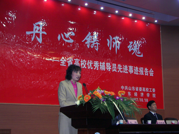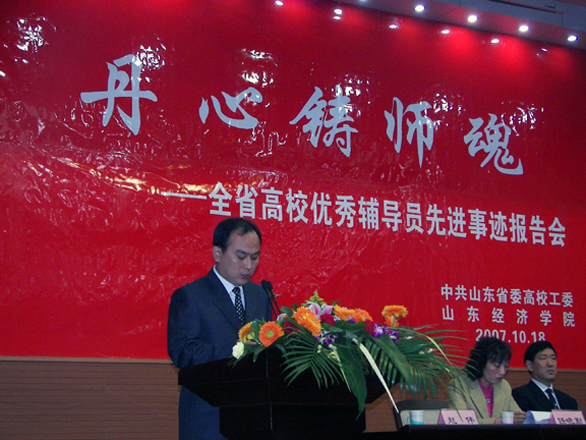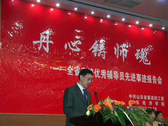 10月18日上午,永利官网全体辅导员及学生处部分工作人员参加了由省委高校工委主办的“丹心铸师魂--全省高校优秀辅导员事迹报告会”。报告会在山东经济学院举行,省委高校工委宣教处副处长张洪英为报告团团长,青岛科技大学聂广明、中国石油大学赵伟、山东建筑大学任晓勤分别作了报告,山东经济学院副校长牟思伦主持了报告会。