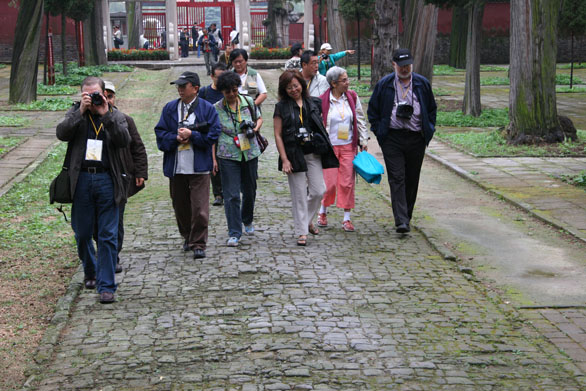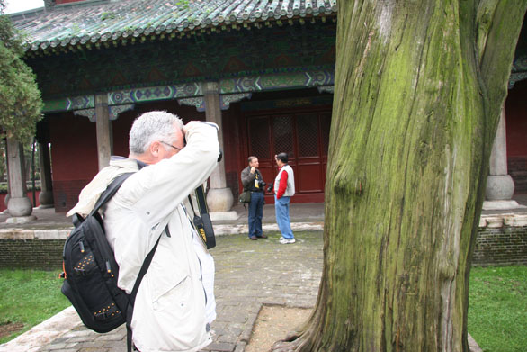 下午3时,摄影家们来到邹城孟庙、孟府。孟庙是历代祭祀孟子的地方,孟府是建于宋朝、孟子的嫡系子孙世代居住的地方。孟庙庄严肃穆,庭院中载满了虬劲苍翠的桧柏和侧柏,方砖砌成的林间小路上长满了青苔;孟府则古典雅致,富有生活气息。摄影家们漫步其中,不时将镜头对准独具中国特色的建筑和那些有着悠久历史的树木。孟府、孟庙中关于“孟母三迁”、孟子理论学说的宣传介绍也加深了他们对齐鲁文化的认识。