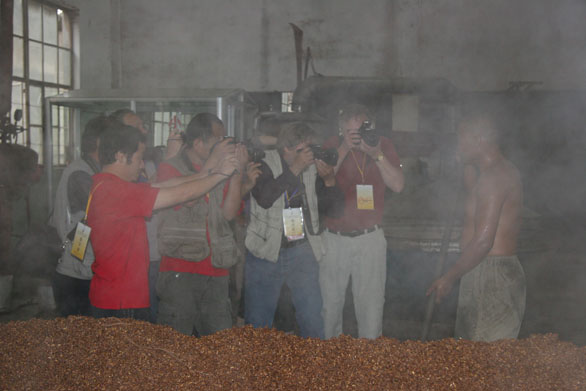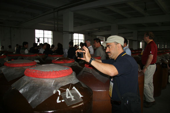 随后,摄影家们前往孔府家酒厂,参观了酒文化展厅和酿酒全过程。山东酒文化源远流长,展厅内展出的各个时期的酒器、孔子与弟子论酒的雕塑等使国际友人有了直观的了解;在基酒储存库和酿酒车间,工人们热火朝天的劳动场面深深感染了参观的摄影家们,大家纷纷抢占有利地形,抓拍劳动中的感人镜头。