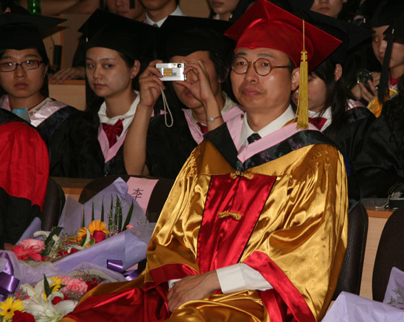 在激昂的乐曲和热烈的掌声中,获得学士学位的毕业生们依次登上主席台。学位委员会主席、院长