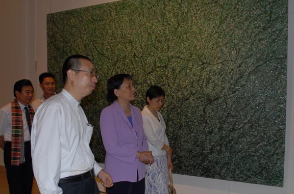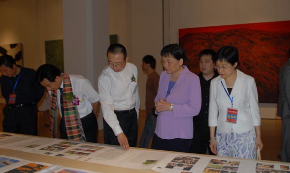 2007年5月23日,当代·民间——潘鲁生当代艺术与民艺文献展在中国美术馆开幕当天,全国政协副主席、中国民主同盟中央常务副主席张梅颖在304am永利集团官网院长潘鲁生等人的陪同下参观了展览。 张梅颖对潘鲁生的艺术创作和民间艺术学术研究给予了很高的评价。张梅颖说,潘鲁生的作品跟一般画家创作的水墨艺术作品不一样,把民间剪纸、年画门神这些传统的民间的东西变成一种新的,但是又反映中华文化传统的艺术作品,是一种艺术创新,是对中国文化的一种发展,值得研究学习。同时这也是潘鲁生对祖国民间传统文化的千年积淀深刻理解的体现。张梅颖进一步指出,潘鲁生教授对民间艺术的发掘、研究、保护和传承,做出的这些大量工作,关系到我们社会主义新农村精神文明和物质文明的建设和发展。这与农村人民群众切身利益是密切相关的。这也是贯彻党中央落实科学发展观,构建社会主义和谐社会的重要内容。胡锦涛总书记提出了构建社会主义和谐社会的总体目标,这就要求我们,既要实现社会主义新农村经济产业建设,也要大力发展农村文化产业建设,让民间的经济、文化、艺术互动起来,让社会主义新农村建设充满活力。