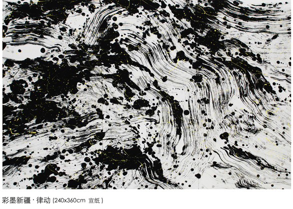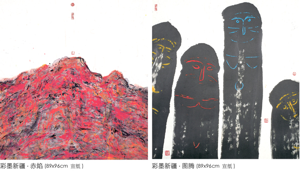 带领考察团穿行于沙漠和绿洲,深入少数民族地区了解民风民俗,先后考察了柯尔克孜族的民族史诗《玛纳斯》、蒙古族“沙吾尔登”舞蹈艺术、阿克苏地区阿瓦提县维吾尔族刀郎木卡姆艺术等具有重要历史价值和民族特色的民间艺术形式。他深深地被这些独特的人文风情和地理风貌所感染。考察结束后,创作了这一系列的彩墨艺术作品。《命脉》以写实的手法和饶有意趣的裁剪展现了沙漠中胡杨树倔强的风骨;《律动》是作者面对漫天黄沙汪洋恣肆时的意绪流露; 《春韵》则在明亮的黄色中展现了勃勃生机的大漠春色,更是对恶劣环境中顽强生命力的礼赞;《阿尔泰的图腾》以粗犷的笔墨,富于表现力的形式,表现了少数民族独特的原始文化……这一幅幅洋溢着浓郁乡土气息的作品,是他在民间艺术中浸润多年的结果。