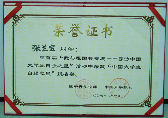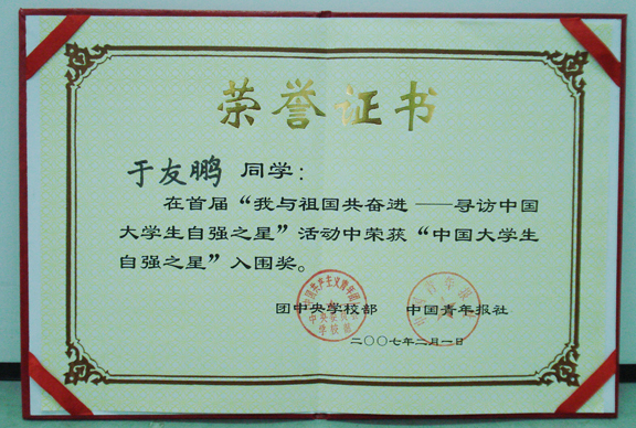 在本次活动的举办过程中,永利官网积极配合团中央的工作,分别推荐了三名校级自强之星。其中,张兰宝同学获得“中国大学生自强之星提名奖”,于友鹏同学获得“中国大学生自强之星入围奖”。永利官网也因积极地参与、大力地支持、出色地组织获得了自强之星评选活动的“组织奖”。