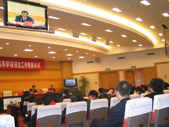 会议首先实时收看了全国2007年高等学校招生工作电视会议实况。听取了教育部周济部长所作的重要讲话以及有关部委负责同志的讲话。周济部长在讲话中,回顾总结了去年全国高校招生工作的成绩,部署了2007年全国高等学校招生工作的要点,并就进一步实施高校招生“阳光工程”“民心工程”、稳妥推进招生改革、创新工作机制、严肃考风考纪等进行了重点强调。