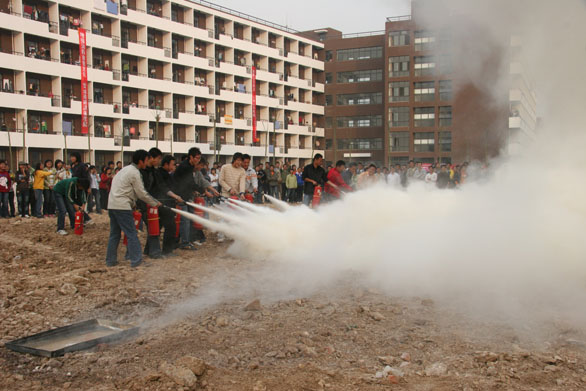 火场逃生演习在17号学生公寓楼举行,各二级学院2005级、2006级学生近400人分布在公寓楼1至3层,校方大队人员点燃特制的放烟罐,滚滚浓烟涌出,学生迅速有序地撤离到安全地带。整个过程持续约5分钟。
