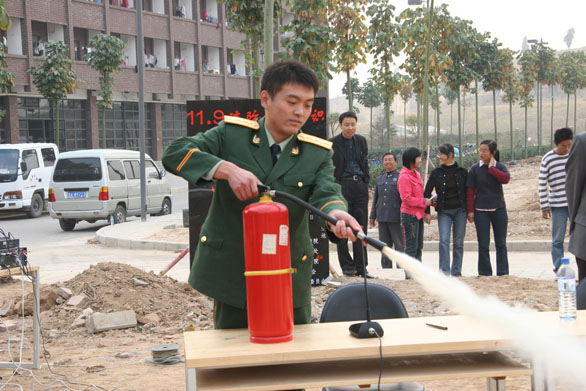 消防大队工作人员为学生讲解演示了灭火器使用方法,并点燃火堆,各二级学院学生代表踊跃上阵,使用灭火器快速扑灭火源。