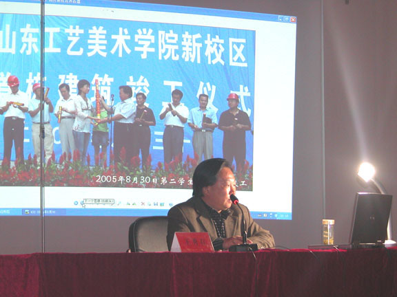 谈到新校区的地理,王副院长以济南市长清区、大学科技园、山工艺新校区为序展开介绍。分别讲述了长清区的交通、支柱产业、旅游景点,大学科技园规划目标,道路网建设,已进驻的高校及新校区的地理位置。他强调,新校区的规划设计组织始终坚持以“设计语言鲜明,国内艺术院校一流”为目标。它的成功之处主要体现在以科学发展观作为根本指导思想,尽可能多的考察国内外优秀校区,养育眼力;精心选择“美术家+建筑师”类型的设计师,与设计师充分沟通相互尊重;充分征求使用者的意见,追求最人性化的设计方案;请国内外名家‘掌眼’;下真功夫撰写《设计任务书》,直到建筑师“为我设计”(如依山就势、相映成美;灵动巧妙、自由活泼;朴素沉稳、内蕴深厚;符号鲜明,异同有致的明确要求。);用科学方法评审、选择设计方案;强调工图会审要细致,防止设计方案在建造过程中走样。