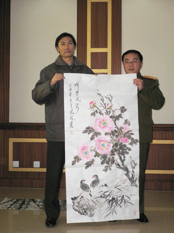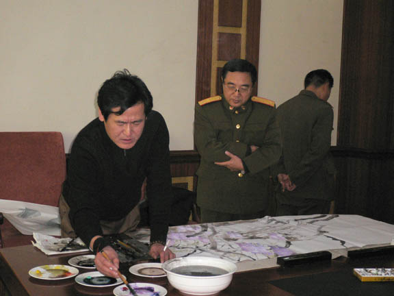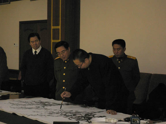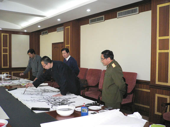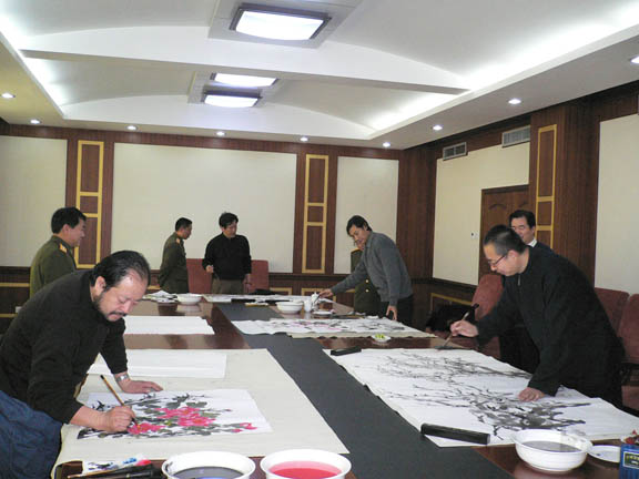 院长亲自挥毫泼墨,带领诸位画家为部队驻军现场创作了多幅国画作品。