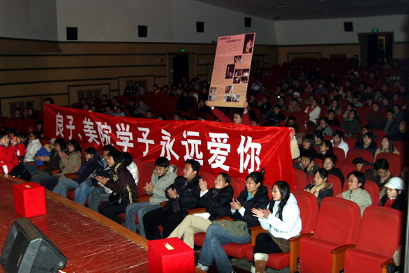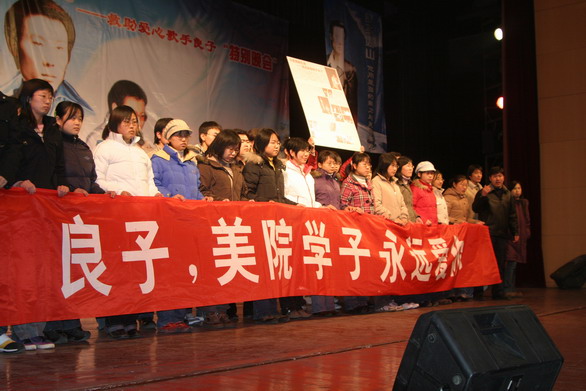 12月3日晚,我院学子“关注血癌歌手良子”的活动再次在历山剧院上演。40多名学生代表打着“良子,美院学子永远爱你”的条幅,在团委副书记王妍的带领下顶着严寒来到“为奉献者奉献——救助爱心歌手良子特别晚会”现场,共同为良子祈祷。聂亚陆同学登台演唱《好大一棵树》,向良子送上全院师生的祝福:“我们每一个人在心中为你种下一棵生命的常青树,愿您的生命之花点燃人世的爱心,愿世间所有的温暖与力量集结于您一身,愿您的生命自强不息、丰硕无比”,言辞之间,深切表达了对良子的关心和关爱之情。寒夜情暖,美院学子为奉献者燃烧爱的火焰。