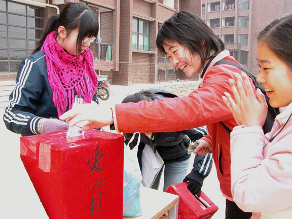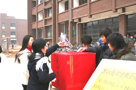 2005年12月3日中午,我院长清校区“关爱血癌歌手良子”募捐箱前人头攒动,大家纷纷伸出援助之手,献出自己的爱心,冬日的寒冷丝毫抵挡不住同学们的热情。