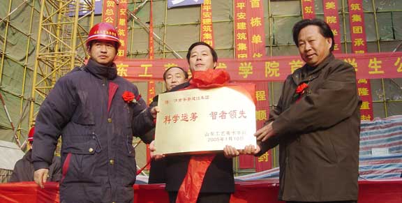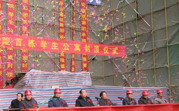 2005年1月10日,天气晴朗,阳光灿烂,朔风凛凛。我院新校区17号学生公寓建设工地上红旗招展,机声隆隆,呈现出一片大干快上、热火朝天的建设和喜庆景象,承建该建筑的济南平安建筑集团将为建筑封顶举行隆重的庆祝仪式。