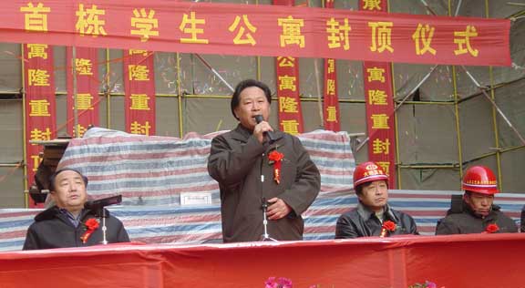 济南平安建筑集团董事长邹景泉先生在庆祝仪式的讲话中对学院和各方部门的支持和帮助表示衷心的感谢,并决心以缜密的组织、精心的管理、更大的干劲将学生公寓建成“精品工程”,向学院全体师生献礼。