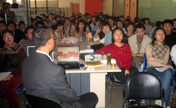 为了深化教学改革,加强课程建设,2004年11月8日-11日,304am永利集团官网装潢艺术设计系为四年级学生开设了“专家课题实践”课程。此次课程聘请了北京丽风品牌形象战略机构的郑铭宏先生来主持,并带来实际的操作案例贯穿全部课程。郑铭宏先生毕业于清华大学美术学院(原中央工艺美术学院),多年以来从事市场营销、平面设计、产品造型及展示设计等工作,由此研究并实践“有效美学行销理论”多年,负责了“Volvo,Wella,Schneider,AirCanada.JAL”等国际品牌在中国市场的促进项目,并为一些国内品牌进行了具体的项目创建,达到了良好的形象上升力之效果,2003年被评为“中国杰出广告人”、2004年获六项中国优秀品牌形象设计奖,有着丰富的实战和研究经验。对于即将踏入社会的大四学生来讲,如何溶入社会,如何从学生的角色转为职业设计师,是他们所面临的最迫切的问题。郑铭宏先生带来的案例式教学方式,互动式的课堂氛围,给我们的教学以启发,也给毕业生们打开了一个面向社会的窗口。同时丽风公司还为此课程设立了课程奖学金,使课程教学与实践操作更加深化和具体。