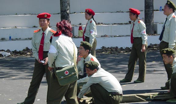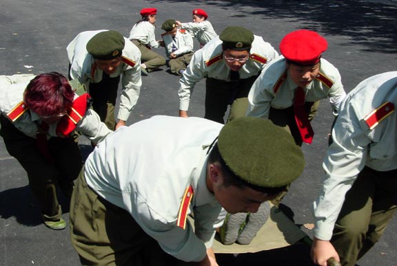 汇报表演的科目为对列、旗语、军体拳、战场救护等。